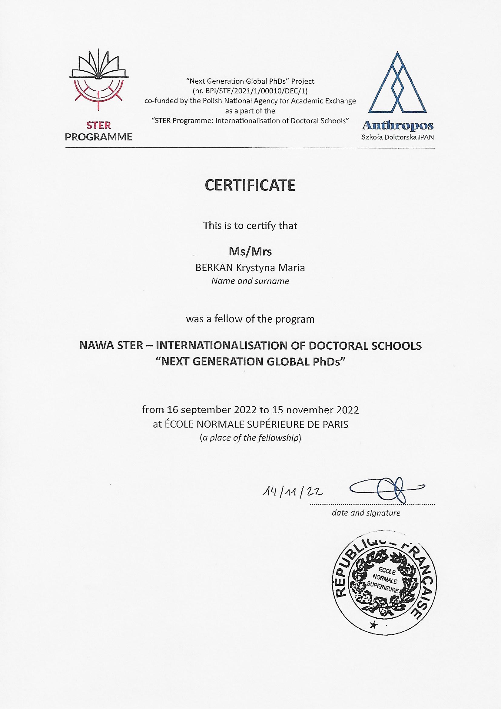 Krystyna Berkan niedawno wróciła z dwumiesięcznego stażu w École Normale Supérieure de Paris, gdzie m.in. prowadziła kwerendy do swojej pracy „Irena Lorentowicz (1904–1985). Scenografka i malarka”, realizowanej w Instytucie Sztuki PAN, pod kierunkiem prof. dr hab. Lidii Kuchtówny. Zwieńczeniem pobytu w Paryżu, dofinansowanego przez Narodową Agencję Wymiany Akademickiej (NAWA) w ramach programu STER (projekt NextGenPhDs), było uzyskanie certyfikatu.
