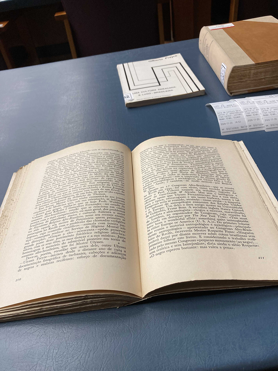 Po przylocie i zakwaterowaniu się poinformowałem mojego portugalskiego opiekuna naukowego, profesora Pedro Airesa Oliveirę, z Instituto de História Contemporânea, jednostki przynależącej do Uniwersytetu NOVA w Lizbonie, że jestem na miejscu. Umówiliśmy spotkanie, podczas którego omówiliśmy moje plany i czas trwania wyjazdu. Otrzymałem również szereg wskazówek bibliograficznych dotyczących istotnych prac dla mojego doktoratu. Dalsze dni mijały na intensywnej pracy w Biblioteca Nacional de Portugal (Portugalskiej Bibliotece Narodowej), głównym miejscu moich badań przez cały wyjazd. Procedura zawsze była taka sama; po zostawieniu rzeczy na portierni przy wejściu głównym zamawiałem z katalogu głównego Biblioteki różne materiały i udawałem się do wybranego miejsca w czytelni głównej. Tam, w ogromnej sali liczącej 240 miejsc spędzałem kolejne godziny, zapoznając się bądź z dorobkiem bohaterów mojej pracy doktorskiej, bądź z materiałami związanymi z tematyką mojej dysertacji, tj. historią portugalskiego imperium kolonialnego, historią rasizmu, dziejami Szkoły Medyczno-Chirurgiczną w Indiach Portugalskich czy monografiami dotyczącymi postaci i myśli Gilberto Freyre’a. Moje prace prawie zawsze przerywał dzwonek, który sygnalizował, że godziny otwarcia czytelni zbliżają się do końca.